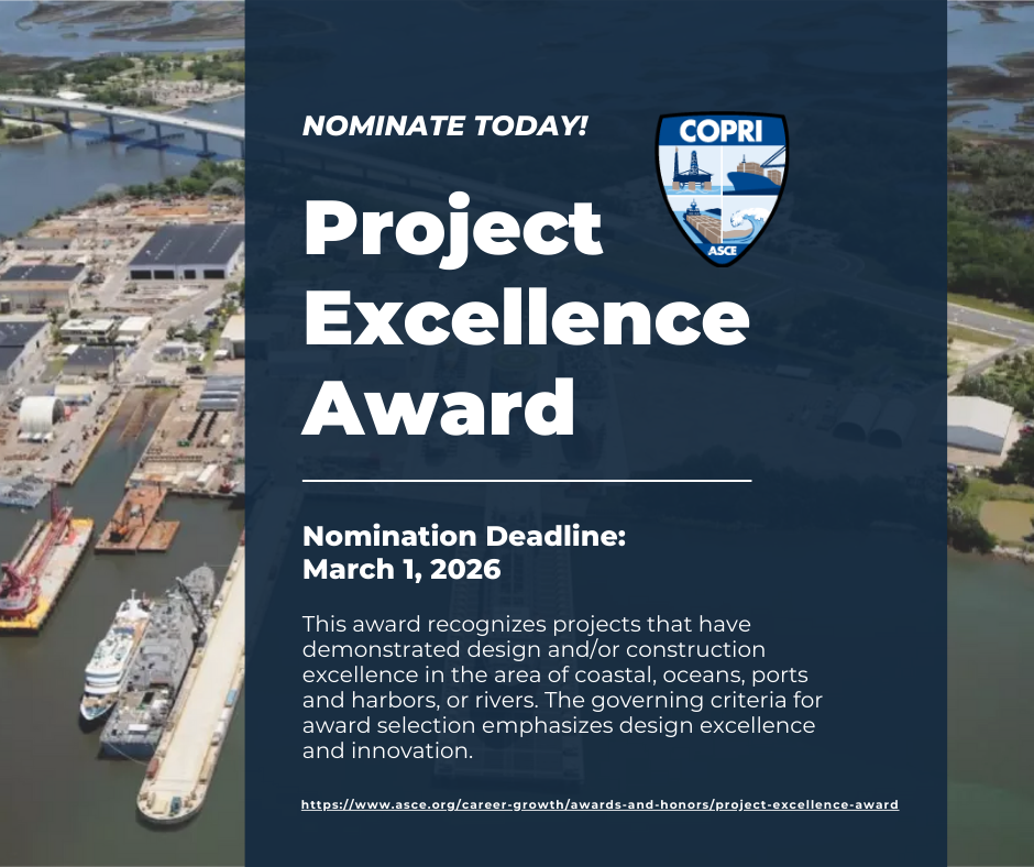 Do you know a project that exemplifies innovation, design excellence, and meaningful impact within coastal, ocean, port, harbor, or river engineering? The COPRI - Coasts, Oceans, Ports, and Rivers Institute is now welcoming nominations for the Project Excellence Award - recognizing outstanding achievements in design, analytical techniques, technology use, adaptive reuse, and environmentally mindful solutions.