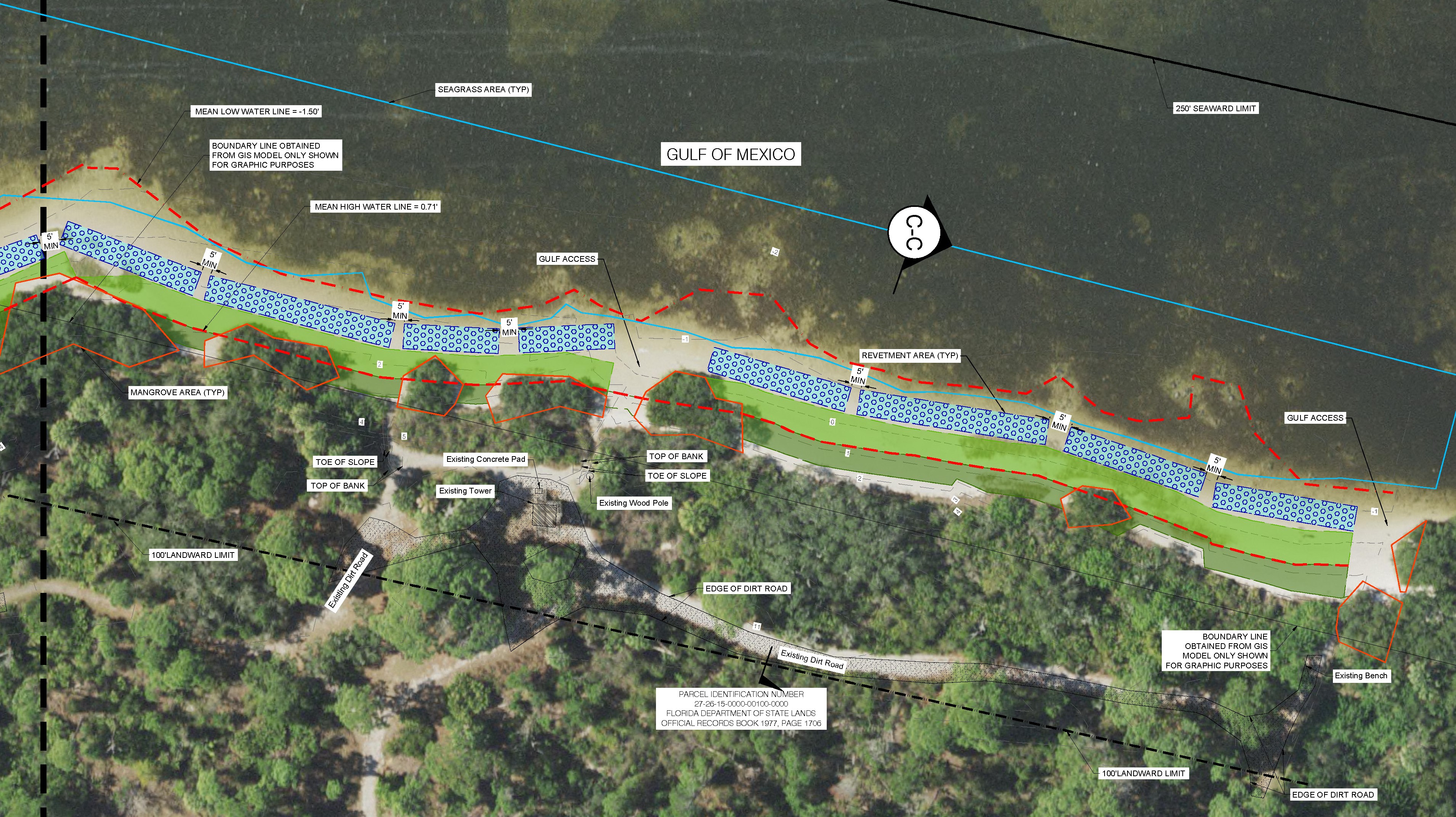 At Anclote River Park, the conceptual design combined oyster bag breakwaters with native vegetation plantings along a low-energy shoreline. The oysters were suitable for the calmer conditions and were intended to dissipate wave energy, trap sediment, and support habitat development while the vegetation further stabilized the shoreline and enhanced ecological function. At Key Vista Nature Park, the LSP incorporated both structural elements and extensive plantings of mangroves and saltmarsh species. Because the site experiences higher wave energy, more robust erosion control features were paired with vegetation to rebuild natural buffers, reduce erosion, and promote biodiversity. Robert K. Rees Memorial Park faced high-energy conditions and a constrained shoreline due to a failing seawall and limited buffer width. The LSP recommended a hybrid approach that reinforced the seawall and layered in native plantings and living shoreline elements to absorb wave impacts, reduce erosion, and improve long-term resilience. Across all three locations, vegetation and structural components were used, but the type and scale of the structures were dictated by the site’s energy environment. Designs were informed by hurricane impacts, wave dynamics, and environmental sensitivity to confirm site-specific effectiveness.