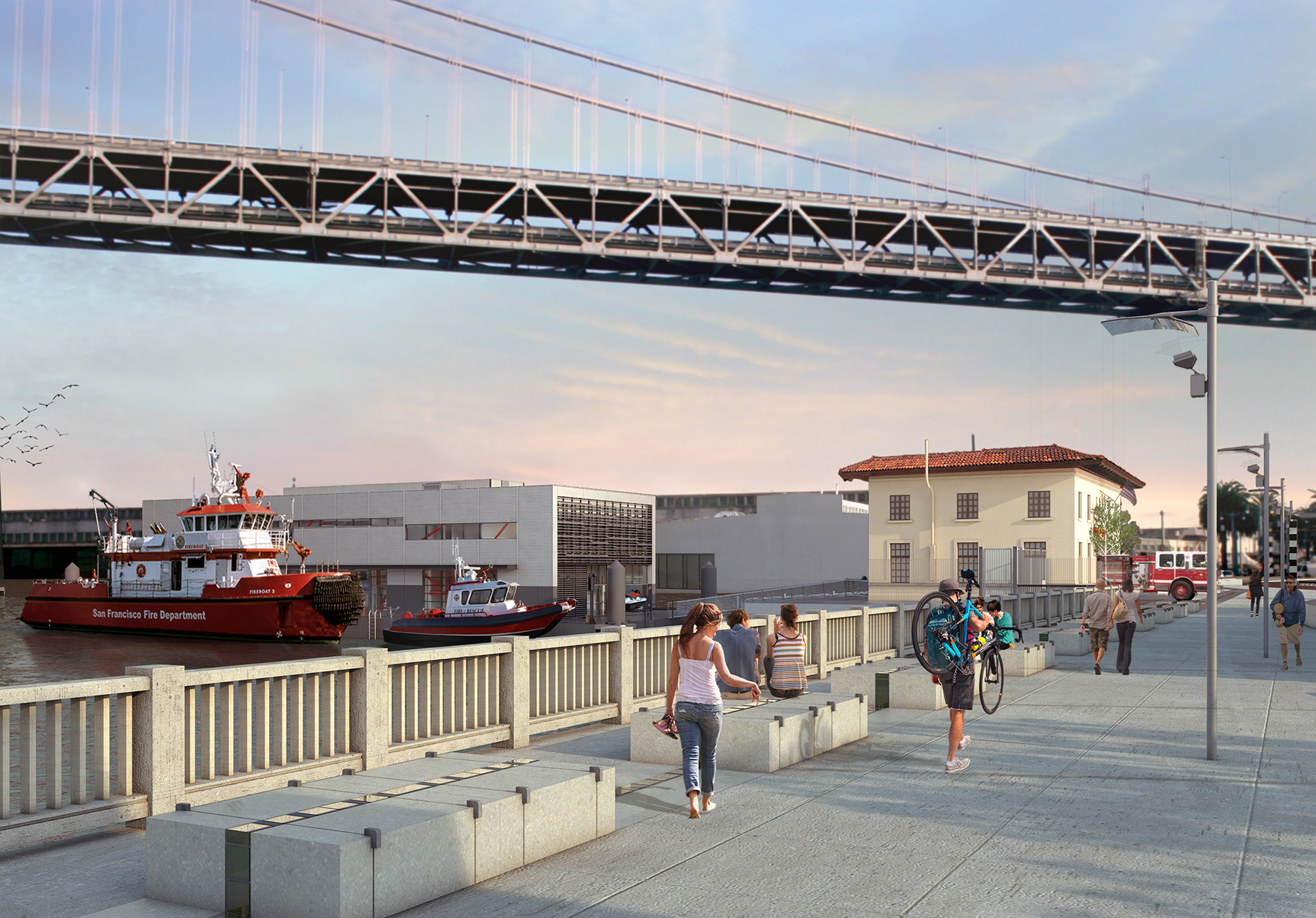 The $39.9 million floating station will provide berth for the city’s three fireboats, the Phoenix (1954), the Guardian (1951), and the St. Francis (2016). These boats are crucial elements in the firefighting arsenal of a city surrounded on three sides by water and that was all but leveled in a catastrophic earthquake and fire in 1906. It will also house a new fire station command center; repair, maintenance, and fabrication facilities for the fireboats; and residential areas for those on duty.