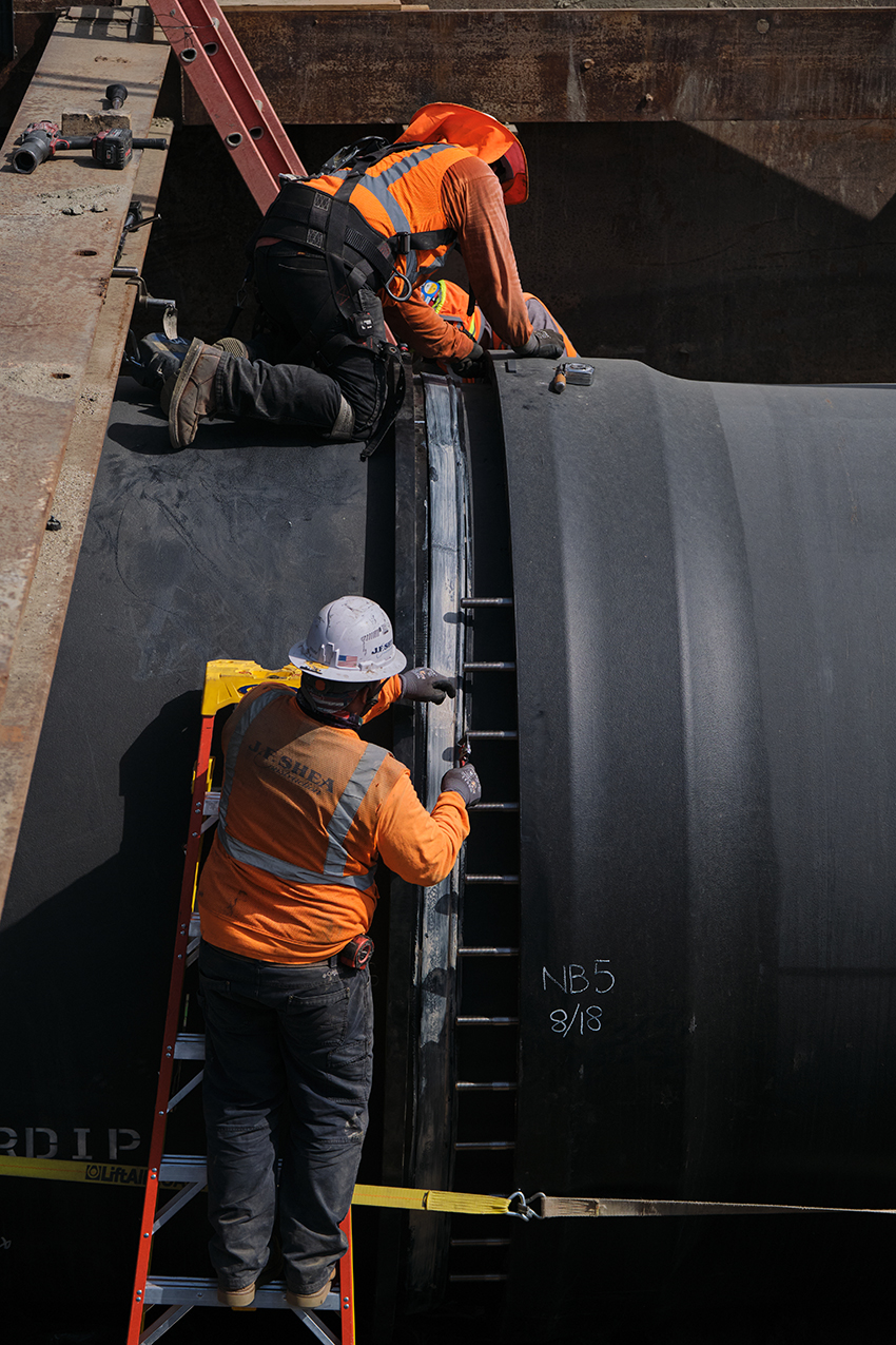 The new sections of welded steel pipe match the 148 in. diameter of the original siphon, but the ERDIP sections — manufactured in Japan by the Kubota Corp. — are available in a maximum diameter of 104 in., he adds. As a result, the ERDIP segment consists of two side-by-side pipes — known as barrels — connected to the new steel sections by steel Y-branch transition pieces.
