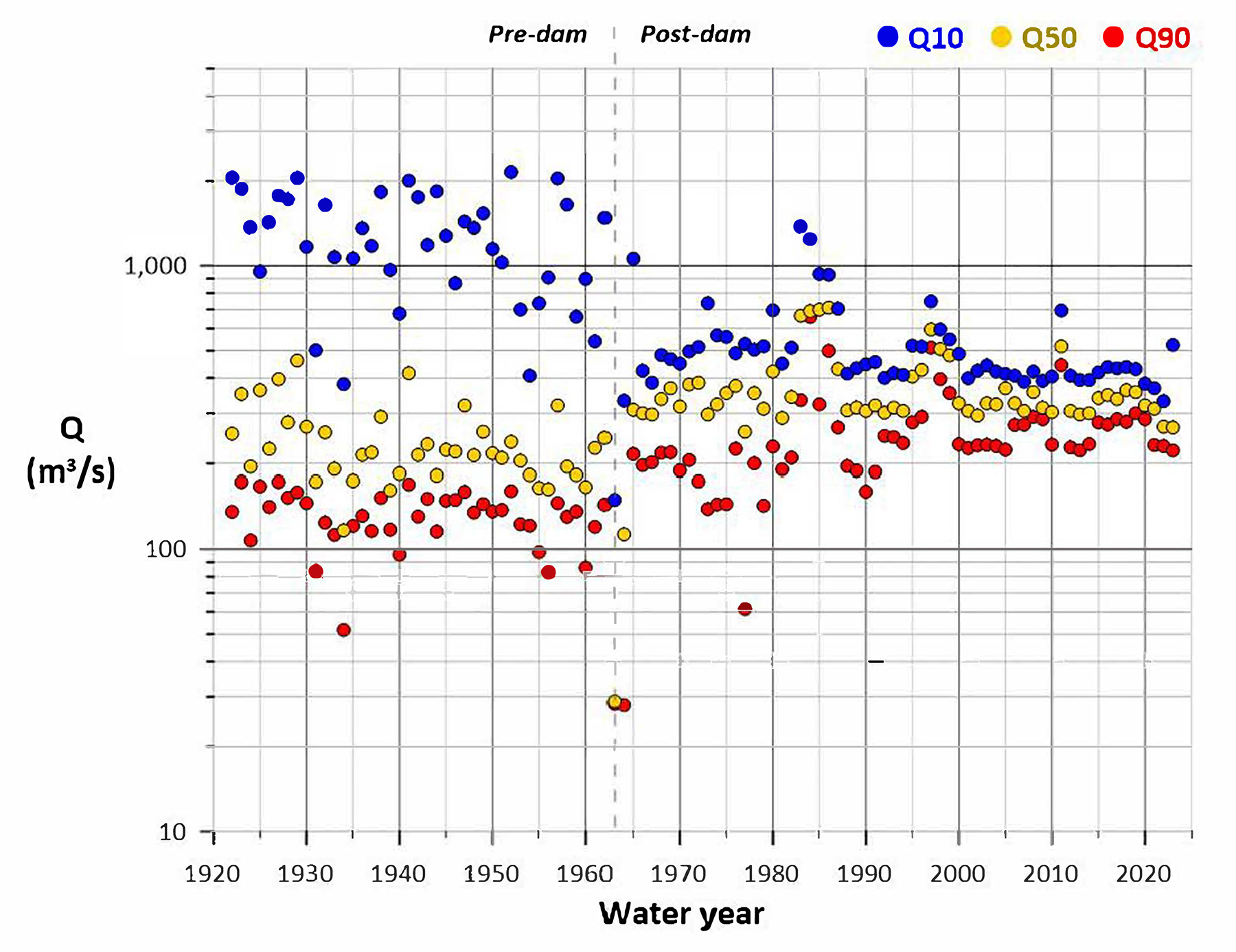 Using the left wall approach, Figure 4 shows annual FDC points for the Colorado River before and after the construction of Glen Canyon Dam. Before 1963, the river was unregulated, with data showing a large flow range. After 1963, dam releases caused the range and variability of flows to be modified considerably.