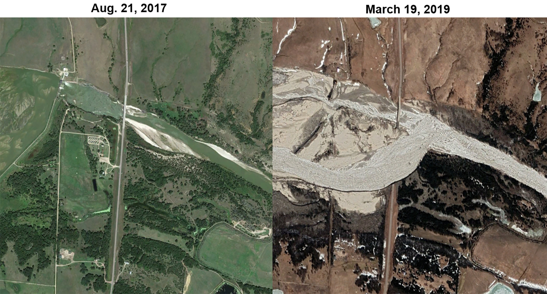 Side by side aerial photos show a dam from 2017n that was breached by a large storm in 2019.